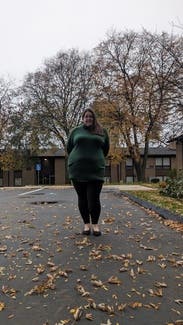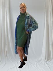 Loved the fit but too short to be work appropriate (better with thick tights, but still was mid-thigh). Cute sleeves and button detail to elevate a simple sweater dress. Very warm, so if your building heat runs warm in winter, be aware. Fit over my second trimester bump (2nd pregnancy).