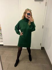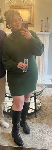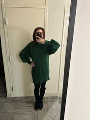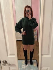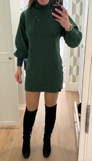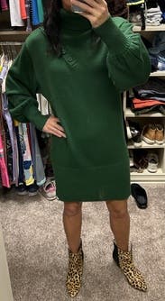 Love this sweater dress. It's easy to wear, warm, and cute. I wish the opening at the shoulder opened a bit more. Wore with tights and flat otk boots.
