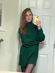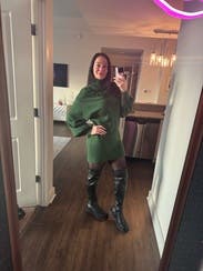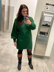 Wore to a 60th birthday party at home on a rainy spring day. Kept me cozy with the soft sweater material but the vibrant color made it still springy. Many compliments came from the color 😁 Paired with tall black boots, big gold earrings, & a cute up-do! Knew I didn’t want to wear tights underneath and was worried it’d run short, but the length was great.