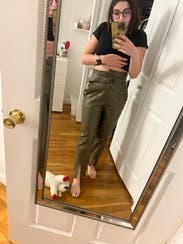 I love these pants and deliberated intensely before deciding to buy the black version since I need more black pants. They're easy to pair with tops and have interesting details like the belt with grommets andd stitching at the knee