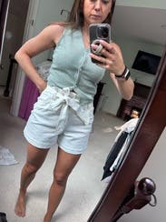 I love these shorts so much I bought them almost immediately. They are comfortable with just enough stretch, but also a nice enough fabric they can dress up a casual shirt. I love the way the pleating and cinching of the waist makes the fabric lie while highlighting my waist.