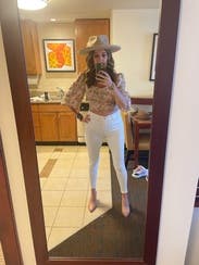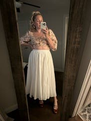 I sized up to a 4 from my usual 2 and was so glad I did. There is no stretch so I needed the extra room. The shirt was cute, the only downside was the shoulders kept falling off.