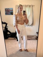 THIS TOP IS SOOOO CUTE, super faltering and so fun and easy. I wear a 4 but i was a swimmer so my shoulders and ribs are little bigger and the top was tight on the last button.