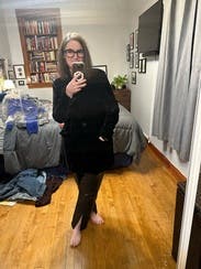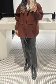 I wore this with sweaters, t-shirt and blazer and it looked great every time. I’m not used to the split hem but got used to it. Wore with doc martens and with vans. Warm but so comfortable.