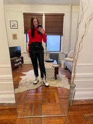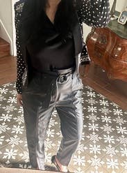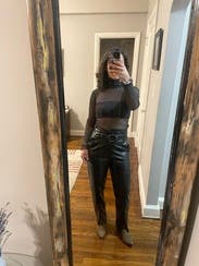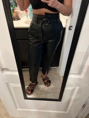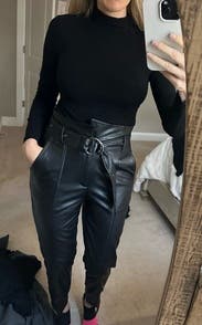 I love these pants! The high waisted fit is perfect. They’re great with a tight top and heels for a night out but can also be dressed down with a long sweater and sneakers/flats for work. Thick leather material that doesn’t squeak or feel like plastic. I bought them as soon as I tried them on!