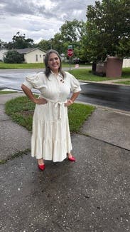 Such an amazing versatile dress! Can be tied in multiple different ways to your liking! This dress is very forgiving and has a relaxed fit, however, the belt accentuates the waist in such a flattering way. This dress is perfect for the office and comfortable enough to wear all day long! I would recommend wearing nude undergarments with this dress due to the light color. This dress also has pockets!!
