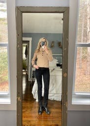 I had a hard time styling this like a turtleneck as pictured. The sweater itself is pretty boxy and slightly cropped and not a flattering shape. Overall the sweater is interesting and I wouldn’t say outright ugly, but not necessarily cute. I don’t know that sizing down would have fixed my issues either.
