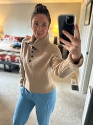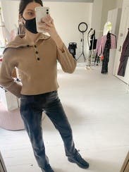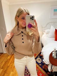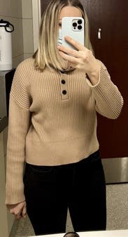 A great staple sweater for any wardrobe. The color is the perfect winter neutral and the detailing on the collar adds a little something different than your average winter sweater. The collar can button up all the way to the top which allows you to wear it in different ways. I found it ran a hair small - had I purchased I may have wanted to try the small vs XS mainly for the length in the arms. I found the length of the sweater to be perfect, graced the top of my high waisted pants