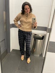 This sweater has everything! Style, comfort, versatility, and wasn’t itchy. I loved it so much I wore it nearly 6 times. It was great with plaid pants like pictured but also wore with a black pencil skirt.