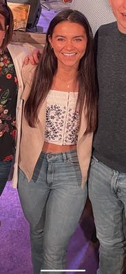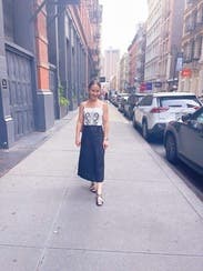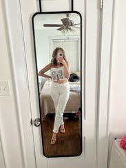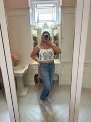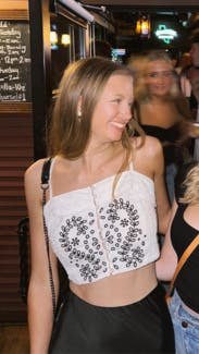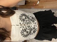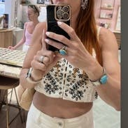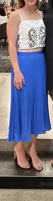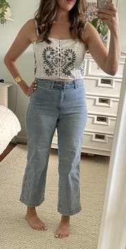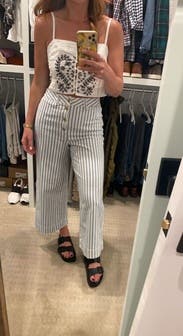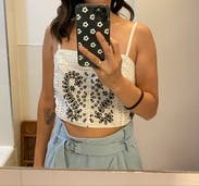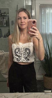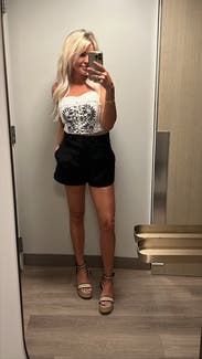 I wore this top twice- once to try on wedding dresses w/ a black slip skirt and the other to a brewery (pictured). The top is very cropped, like above your belly button, so keep that in mind. It also has a very boxy fit so I would wear something form fitting on the bottom. Lastly, the straps are adjustable which is nice but there is no stretch at all. Overall, I liked this top and it served its purpose! Nothing I couldn't live without though.