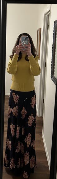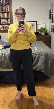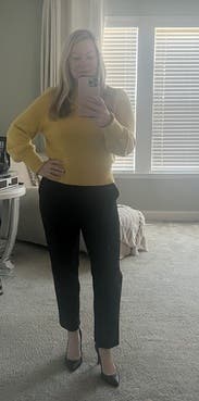 This sweater is cropped so if I was wearing to work in person it might not have worked. Great mustard color for WFH. Narrow in the shoulders so size up if you’re in doubt.