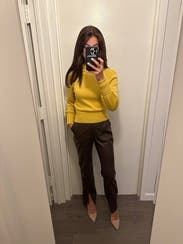 This sweater is meant to be worn with higher waisted pants as it's a bit on the shorter side. I wore this casually with jeans and also to work with the Club Monaco Pink Trousers, which had a bit of yellow in the plaid print. They went together great! The color is awesome, and the quality is very good. I wore this three times before returning it!