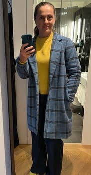 I seem to have rented this 3 times! Great bright mustard, quite heavy material, gd for autumn / spring. It’s cropped though so I’d size up.