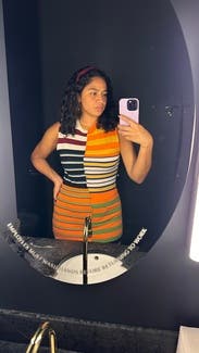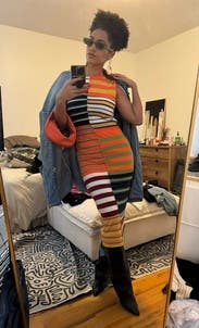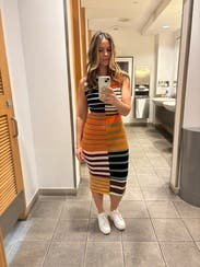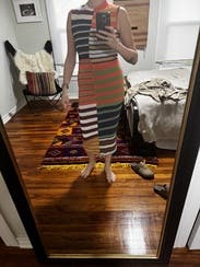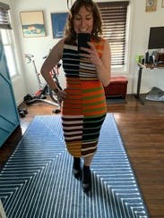 This fit so well! Cozy from the knit fabric and bright with color. A good bit of stretch with this one if you're worried about sizing. It's longer than I thought, which you can't see in the pic, but overall obsessed and received a lot of compliments!
