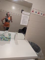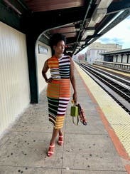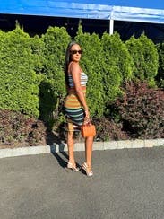 Fits tight, size up if you want a loose look! If I rent again I’ll likely go up 1-2 sizes. The fabric is a thicker material so hides imperfections, and the colors are so bold and fun. You can tell the quality is expensive! This is an easy outfit to dress up or down.