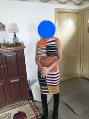 Multicolor stripe knit (100% Virgin Wool). Sheath. Sleeveless. Crewneck. Pull on. 48" from shoulder to hemline. Imported.