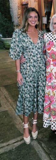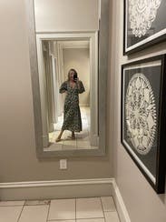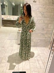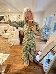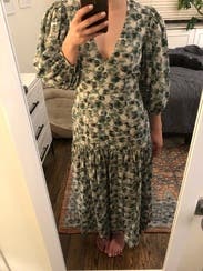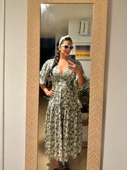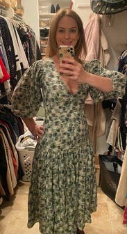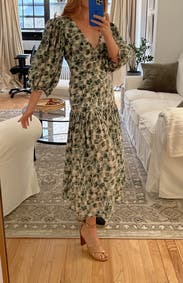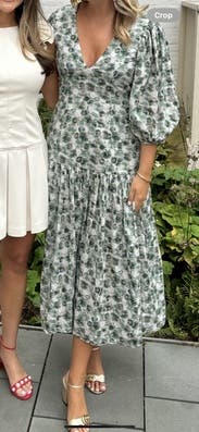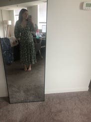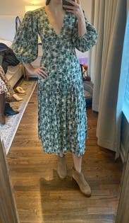 This dress looks so much better than expected once you put it on. The fit is flattering and close to the body. A little lower cut in the chest than I expected. Side zipper was comfortable to get up. The skirt of this dress moves so beautifully and feels great on. Love the muted colors of green and this is perfect for the summer to fall transition but would be just as good for spring. I will probably rent it again. Posted a photo on social and got a call the next day from a friend telling me how great that dress looked.