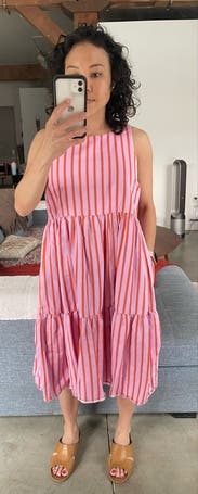 When I pulled this out of the bag - even when I tried it on - I thought "nuh uh, absolutely not." It seemed like a voluminous, pink circus tent on me. I changed out my bra for a sports bra and that was key - minimizing my chest made it look less like a maternity dress. The more compliments it garnered throughout the day, the more I ended up coming around to it. The fabric is heavy and stiff, but somehow not hot.