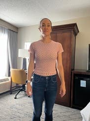 Love the two layered mesh look. It's the cutest little tee shirt to jazz up my usual basic outfits. it's slightly cropped. will rent again!
