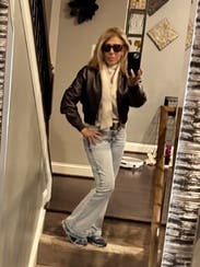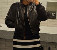 Great quality comfy bomber leather jacket. This leather jacket is so easy to move in and not stiff at all! It can be layered with really any outfit from jeans to dresses with an ideal fall brown coloring.