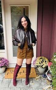 This is a great cropped bomber jacket. It is FAUX leather, but it still has a very expensive look to it even though it’s not that expensive I love the way it fit. It was just the right amount of cropped. For a jacket it is also pretty warm. You could pair this jacket with anything I want it.
