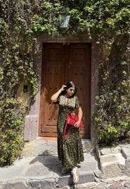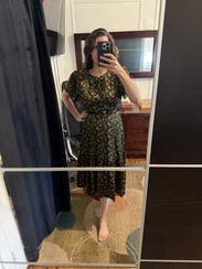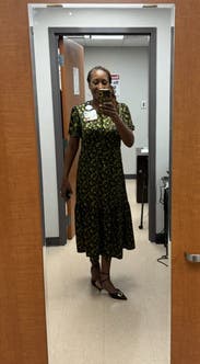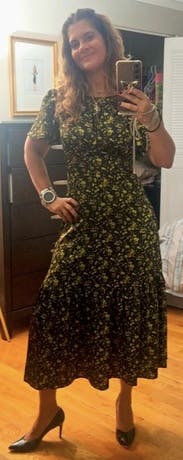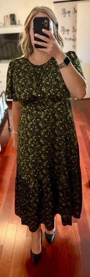 Beautiful dress that I wore all day and never felt uncomfortable! There is no fabric constraining the armpit area which is nice when it’s hot but you need your shoulders covered. Because I’m on the shorter side, it hit me at my ankles rather than mid-calf like the model.