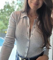 Grey (35% Tencell Loycel, 30% Nylon, 17% Cotton, 14% Silk, 4% Elastane). Knit. Collared. Long Sleeve. Button front closure. Shoulder to hemline: 23". Imported.