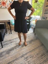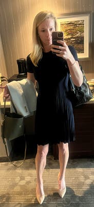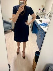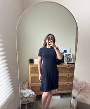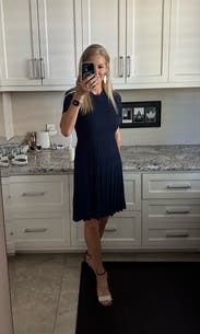 This is a flattering navy dress. Nice option for work. It was stretchy on top and flowy on the bottom.
