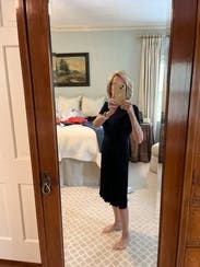 Perfection! Perfect length, great condition, fantastic shape. It’s form fitting without clinging to the tummy area. Chef’s kiss!