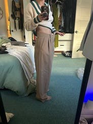 These are a great pair of neutral trousers! I love the high waist and the front pleats. They run big, so I would recommend sizing down. I would have kept them and worn a few more times if they had fit better. They also are very long. I'm 5'9" and wore 2.5in heels, and they were the perfect length.