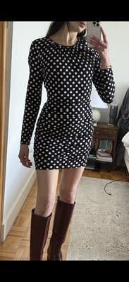This Michael Kors dress features a playful polka dot pattern on a classic body-hugging mini silhouette. The long sleeves add a balanced contrast to the short hemline. Pair with simple heels and a sleek clutch to let the bold print stand out.