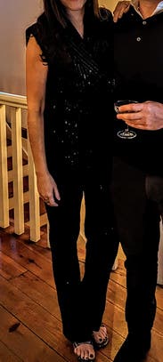I wore this dazzling ensemble to a speaking engagement and it is a STUNNER. I felt fabulous. I received a million compliments. I will say that the waist of the pants was too small for me so I had to jerryrig them to zip them up. I wore a top to conceal the behind the scenes contraptions holding it all together. I highly recommend.