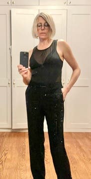 These are great and just sequined enough to be fun but still work-party appropriate with the right top. I'm planning to wear them for NYE with a velvet top, and I may pair them with a red blouse or sweater for my office holiday party. 6 is my go-to size in high waisted pants, and they fit perfectly. I can size down to 4 sometimes, but I think the 4 in these pants would be too tight in the waist for food!