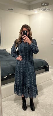 Loved this dress for a summer evening event! The material is light but feels luxe, and the flowy silhouette made it super comfortable to wear all night. The subtle snakeskin print gave it just the right amount of edge while still feeling elegant. Paired it with white heels and a pearl chain got tons of compliments! Great pick for client dinners or semi-formal gatherings.