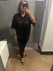 The lacey shirt runs slightly big, but I think the camisole underneath runs true to size. So if you size down, the camisole might be snug. But I felt great in it. I wore it with black dress pants and black jeans.