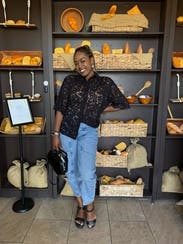 It gives edgy feminine. Got a ton of compliments. Fits a little oversized but like tucking the slip layer into jeans so you could see the silhouette of my body through the lace. Wore it with a minimizer bra and it made a big difference. Will definitely rent again!