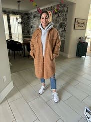 For a lighter winter coat this shacket is so good. The color is neutral but also gonna be a little different than the rest of your stuff. Hits at a nice length and is cute open and easy to button up.