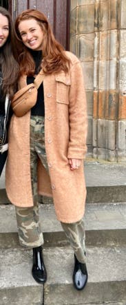 A great take on the “shacket.” Warm but not too warm, light but not too light. Great honey beige color. Perfect for layering and keeps your thighs toasty. Fabric is kind of a slightly mohair situation but mercifully it did not shed on my black sweater. I should probably buy it.