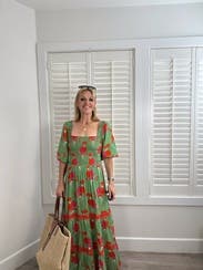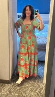 I wore this boarding the cruise ship for vacation. It put me right into vacation mood. You can wear on or off shoulder but it doesn’t stay on the shoulders easily so a bit of fashion tape can help. I’m not big busted so I didn’t need a bra with this. It felt light and breezy. I’m just over 5’3” and it came to the floor so I wore with a 1.5” sandal heel. I recommend it.