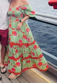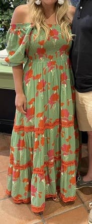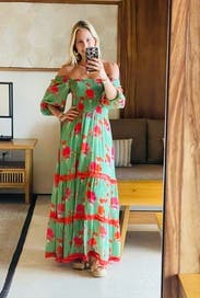 Green floral cotton (100% Cotton). Maxi. Short sleeves. Off the shoulder. Pull on. 57.5" from shoulder to hemline. Imported.