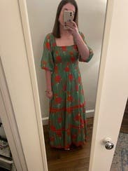 I am a size 6 and got the small because other reviewers said it was a long dress with a lot of fabric, but I do wish I’d gotten the medium. At 5’9” I felt like it was a tad too short. Regardless, the dress is stunning and I got tons of compliments.