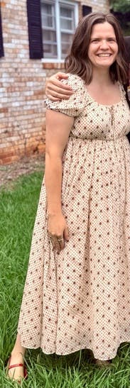 Loved wearing this 6-9 weeks postpartum. Flattering, romantic, but super easy to pull down for breastfeeding. Made me feel like in was in "Emma" :)
