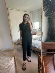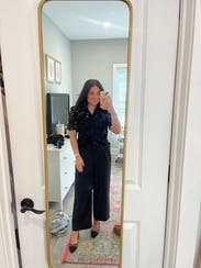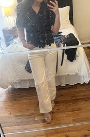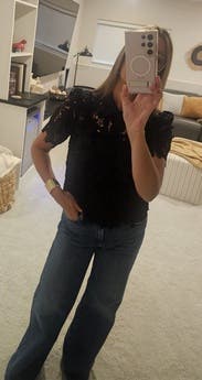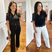This shirt feels expensive and has all the elements that make it high quality - nicely finished buttons, durable lace, soft fabric. I paired it with a black romper underneath, white white jeans, and with satin pants and received compliments each time I wore it. If you’re not into a slightly puffy sleeve then this may not be your thing.