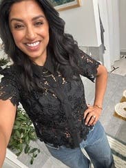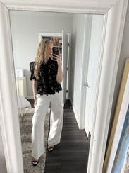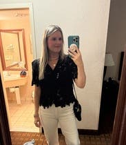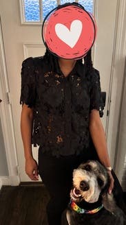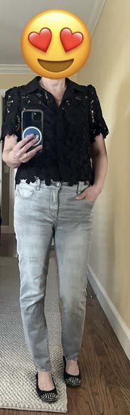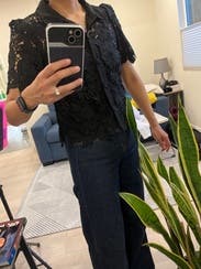 Loved this top! It’s a little bit outside of my lane but I’m so glad I went for it. I wore it for my anniversary dinner and my husband’s first word was “Wow”! The lace is beautiful and the cutouts are such a cool element. It feels like you’re wearing an art piece. If you’re on the fence about whether to rent or not, just go for it! Well worth a rent!