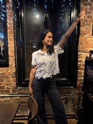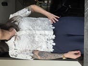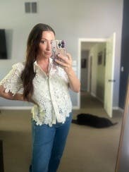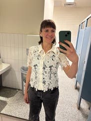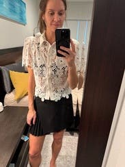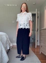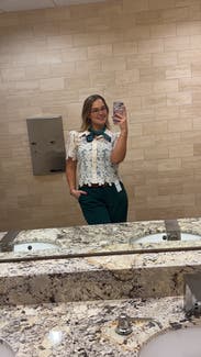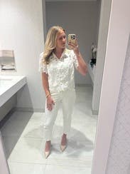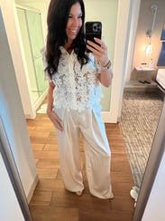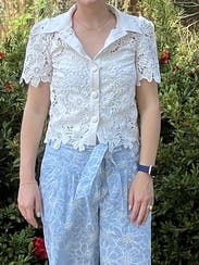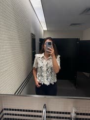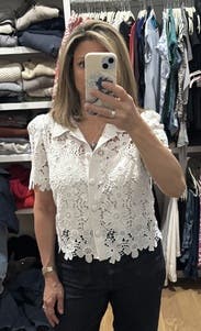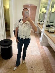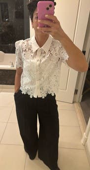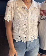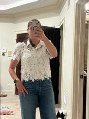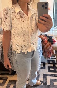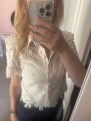 Super cute lace that I wore with blue skinny jeans and heels. Wore untucked to show off the lace hem line. Only issue I had was the bottom 2 buttons popped off. Easy fix to sew back on but obviously was an issue at brunch
