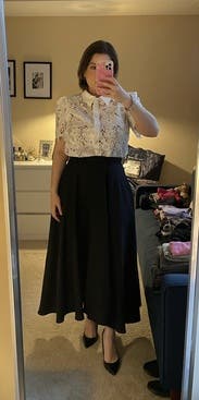 Mad I didn’t get a picture. This is a GREAT top. Ended up renting in navy too. It’s a boxy-er fit so don’t stress too much about sizing if you’re in between. You could likely straddle your size run.