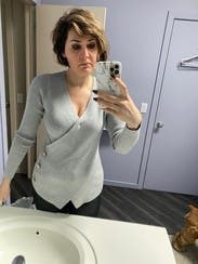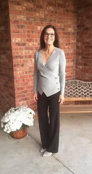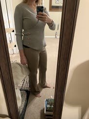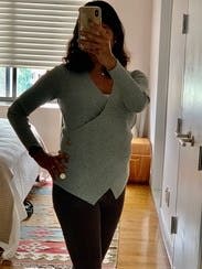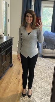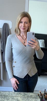 The crossover is flattering and the gold buttons add a touch of class. Thick, quality knit perfect for transition to winter. Wore a cami since it is a bit low cut.