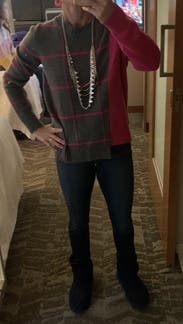 This was a fun, TTS, easy to wear sweater for running errands and family dinner. It fit fine but might be cuter sized up for more of a swingy/boxy fit over leggings.