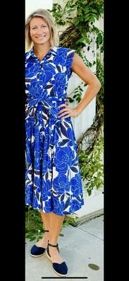 Blue floral (97% Cotton, 3% Spandex). Casual dress. Collared. Cap Sleeves. Button front closure. Shoulder to hemline: 47.75“. Imported.