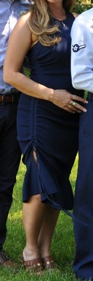 The dress fit great and was flattering. It didn’t show my spanx under through the material. My only complaint is the when I tried to bunch the side it would draw down the armpit hole on that side showing my bra so I just slightly raised it and tied a bow.